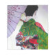 From an original watercolour painting by artist Sacha Grossel of a Japanese Geisha with a green decorated, fashionable kimono and black and red obi holding a purple umbrella decorated with flower blossoms. This Japanese and Kyoto inspired design is influenced by oriental and Asian art and by Japanese traditional fashion design.