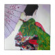 From an original watercolour painting by artist Sacha Grossel of a Japanese Geisha with a green decorated, fashionable kimono and black and red obi holding a purple umbrella decorated with flower blossoms. This Japanese and Kyoto inspired design is influenced by oriental and Asian art and by Japanese traditional fashion design.