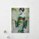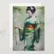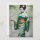 A woman dressed in a traditional green kimono with red obi stands holding a bamboo flute in one hand and a fan in the other. Her hair is elegantly styled with decorative hairpins, and she appears serene against a diffuse background of soft green hues.