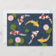 Beautiful minimalistic vector illustration of colourful Japanese koi fish swimming among the water lilies in a pond. Koi is a brightly coloured ornamental variety carp domesticated in Japan.