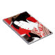 Rich, vibrant colours, including a striking red background and detailed kimono patterns.