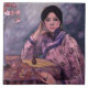 This design features a painting by the Japanese Impressionist artist Fujishima Takeji (1867–1943). It shows an elegant Asian lady wearing a traditional kimono that is mainly pink and purple with a black pattern. She is resting against a table on which a small perfume bottle is placed. There is also a vase of pink roses on the table. It is an image of restrained luxury and elegance.
