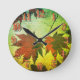 This clock is embellished with a faint script under fallen, autumn, japanese maple leaves. They come in four colour schemes.. Natural yet elegant. Numbers are optional.