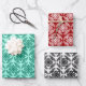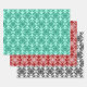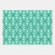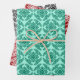 Wrapping paper in a classic Japanese kimono pattern of stylised, four-way, medallions of leaves and flowers in deep turquoise on a soft aqua background, white on a deep Chinese red background, and black on a white background