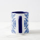 Mug in a classic Japanese kimono pattern of stylised, four-way, medallions of leaves and flowers in deep cobalt blue on a white background