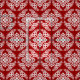 Fabric in a classic Japanese kimono pattern of stylised, four-way, medallions of leaves and flowers in white on a deep Chinese red background