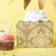 wrapping paper in a classic Japanese kimono pattern of stylised, four-way, medallions of leaves and flowers in light yellow on a deep mustard / golden yellow background