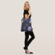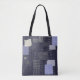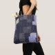 Dark blue tote bag with traditional japanese sashiko printed design that resembles stiches and patches.
