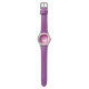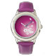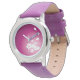 A Kid's Stainless Steel Purple Leather Strap Watch with a simple, cute, and sweet illustration of two Japanese snow rabbits, two Sakura flowers, and four Sakura flower petals against a purple background.
