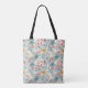 This tote bag has your triple digit monogram in black on a circle banner at the centre. The banner is placed on a pretty Japanese style floral pattern with predominant colours of teal blue, yellow gold, and red on white. The other side has the floral pattern, but not the circle banner or monogram. Distinctive, and personalised just for you.