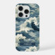 Make a statement with this iphone 15 pro phone case that features rolling Japanese waves in multiple shades of teal blue. The pattern represents surges of good luck, peace, and eternal resilience. It becomes uniquely yours with your name in a CAP font in white on dark teal.