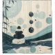 Abstract in shades of green featuring bamboo, water, circles and a balances stone sculpture. The design feels peaceful and calming.