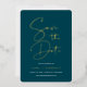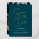 Invite guests to mark their calendars for your wedding with these modern and minimal save the date cards. Simple design features "save the date" in gold foil handwritten script on a rich jewel tone emerald green background, with your names, wedding date, location, and website beneath. Add a favourite portrait-orientated engagement photo to the back.