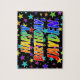 This vibrant, exciting, birthday-themed jigsaw puzzle design has the message "HAPPY BIRTHDAY, JAYDEN" with the characters having a colourful rainbow spectrum inspired gradient pattern, in addition to a fun stars background pattern. A vibrant puzzle like this might be used to send a birthday greeting message to somebody named Jayden. [~Z0000468]