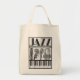 Black and white jazz themed tote bag. Design has a variety of musical instruments including a clarinet, upright bass, old microphone, trumpet, piano, and a drumstick. Great everyday bag for the music lover, teacher, or student. The original artwork was done in charcoal.