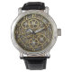 Jazz Trumpet Watch featuring industrial steampunk motive with metallic gears, cogs, wheels set in gold, silver and copper. Unique and cool watch for musicians, jazz club patrons, trumpet players and music fans.