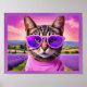 Poster with whimsical fantasy art. A jazzy cat in a trendy turtleneck and purple sunglasses stands against a backdrop of lavender field. Perfect for anyone who loves modern cats, humour, and early summer vibes. with whimsical fantasy art.