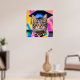 Vibrant square poster with whimsical artwork. This charming tabby wearing a blue grad cap and a tie dye scarf behind a pscychedelic background .