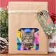 Vibrant square stickers with whimsical artwork. This charming tabby wearing a blue grad cap and a tie dye scarf behind a pscychedelic background .