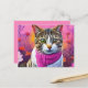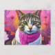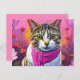 A vibrant spring postcard with whimsical artwork. This charming tabby is wearing a magenta scarf, posing outdoors in a meadow with wild flowers in the background.Embracing a jazzy vibe .