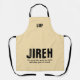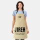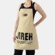 Simple modern buff-coloured Christian monogram all-over print apron with black typography that reads JEHOVAH JIREH, which is based on the Bible verse from Genesis 22:14. The 'Jehovah' is placed vertically within the J of 'Jireh'. At the top there is placeholder monogram. At the bottom is a popular Czech proverb - 'The God who gives us teeth will also give us bread.' This text is CUSTOMIZABLE so you can personalise with your name or wording of your choice (or delete).