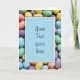 A close up of pastel coloured jelly beans in the background and a blue box with a white border awaits your personal message.