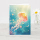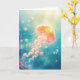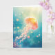 A glowing jellyfish floats gracefully in the vibrant depths of the ocean, its translucent bell illuminated by soft, golden light. Its long, flowing tentacles swirl with a gentle motion, surrounded by colourful, glowing orbs and tiny aquatic creatures. The jellyfish's ethereal beauty is further enhanced by the sparkling bubbles and delicate marine plants that drift peacefully in the serene underwater world, evoking a sense of tranquillity and wonder.
