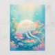 This heartwarming design features an incredibly sweet and round white jellyfish shown swimming joyfully through a vibrant underwater paradise. The jellyfish has a translucent white bell adorned with a delicate pink floral shape on its crown, featuring a blissfully happy face with closed eyes and a small smile. Its long, frilly white tentacles flow gracefully through the crystal-clear turquoise and light blue water. The character is surrounded by shimmering bubbles and a lush garden of hand-painted pink, orange, and yellow coral reefs at the bottom of the frame. Beams of bright golden sunlight filter down from the surface, illuminating the scene and creating a cheerful, magical atmosphere filled with soft light particles. The overall aesthetic is bright, cozy, and full of wonder, making it an irresistible choice for fans of marine life and playful ocean art. This cheerful jellyfish postcard is a wonderful choice for sending a warm "thinking of you" note or a sun-drenched greeting to a friend who finds joy in the colorful magic of the sea. You might choose to use this artistic card for an under-the-sea themed birthday invitation or as a sweet way to share news of a summer beach trip with your family. It also makes a precious decorative piece for a child's nursery wall or a bright addition to a creative scrapbooking project as a small token of aquatic happiness. This versatile design is also an excellent choice for a holiday thank you note, a graduation message, or as a heartwarming way to share a message of joy for any situation or event.