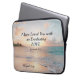 Inspirational quote scripture personalised laptop sleeve depicts a beautiful ocean sunset with blue waves on a sandy beach. It features an encouraging Bible Verse Jeremiah 31:3, "I have loved you with an everlasting love." Customise with a name or details of your choice. Photograph by Sean Oulashin.
