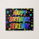 This exciting and vibrant birthday-themed jigsaw puzzle design has the message "HAPPY BIRTHDAY, JEREMY" with the characters having a colourful rainbow spectrum inspired gradient pattern, along with a fun field of stars background pattern. A colourful puzzle like this might be used to send a birthday greeting message to somebody named Jeremy. [~Z0000468]