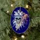Mardi Gras style Jester skull is wearing New Orleans style mask in hues of blue and silvery white and holding a gold skull Jester sceptre.