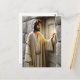 Jesus' presence at the weathered door offers a profound visual representation of divine patience and love. The vibrant sunrise suggests new beginnings, filling the scene with warmth and hope. His hand raised in gentle invitation encourages viewers to reflect on their spiritual journey.