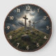 Bring a high-energy and powerful focal point of faith into your home with this realistic Calvary-themed wall clock. The central face features a high-definition graphic of three silhouette crosses atop a rocky, grass-covered hill under a dramatic, cloud-filled sky illuminated by a distant sunset glow. While the artwork masterfully mimics the textured depth of a natural landscape and the outer rim appears to be crafted from weathered, dark-stained timber, this is a lightweight and durable graphic timepiece rather than actual wood or stone. The elevated, golden-style numeric markers provide a professional and polished contrast against the atmospheric backdrop, ensuring the time is easy to read at a glance. This timepiece serves as a sophisticated addition to a study or living area, making it a perfect and meaningful self-gift for those who value high-quality spiritual art.