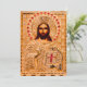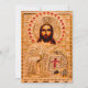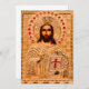 Jesus Christ in gold metal decorated with red stones. Holding a book with red cross. Close up Photography.