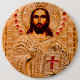 Jesus Christ in gold metal decorated with red stones. Holding a book with red cross. Close up Photography.