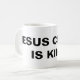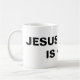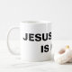 Simple and bold Christian coffee mug featuring the text "Jesus Christ Is King" in black on a white background. Perfect for expressing faith and devotion with a clear, powerful message.