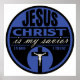 Jesus Christ is My Saviour poster in blue features Christ on the cross. In God I Trust text. Great for Christians devoted to Our Lord and showing devotion and gratitude to Jesus Christ. Perfect for church, youth groups and everyday worship!