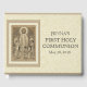 This is a traditional Catholic First Holy Communion image featuring Jesus offering a young kneeling boy and girl Holy Communion. It is surrounded by a lace-like ecru colour border and background. Angels lovingly gaze on from above.