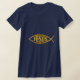 Icthus or "Jesus Fish" in gold lettering pictured on a navy tee