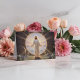 A serene and inspiring AI generated image of the risen Jesus stepping forward from a circular stone tomb at dawn. Warm golden light radiates behind Him, forming a glowing halo effect through the archway. His hands are open in a gesture of peace and welcome, while white doves soar in the soft pastel sky. Spring flowers bloom at His feet, and gentle rays of sunlight symbolize resurrection, hope, and new beginnings—perfect for a personalized Easter greeting card.