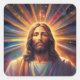 The artistic portrait of Jesus captivates with its divine radiance, as beams of vibrant light and stars surround his holy face, creating a truly mesmerising and spiritually uplifting depiction.