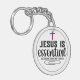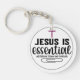 Religious scripture typography, "Jesus Is Essential Yesterday, Today and Forever", Hebrews 13:8, in a simple black text with a simple cross*, a paperclip, and a black round border. Customizable name on the back. *You can open the design tool to change the color.