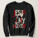 A bold, vintage-style design featuring the text 'Jesus Is My Valentine' in patterns like red hearts, black-and-red patches, and leopard print. The vertical arrangement and muted tones of cream, red, and black create a striking and heartfelt statement for Valentine's Day