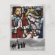 Front of this postcard, version five, features a beautiful framed stained glass design nativity scene with the following message, “Jesus is the reason for the season”. Also featured: three wise men in search of the Messiah, a camel, the star of Bethlehem and a Dove, symbolising the Holy Spirit.
