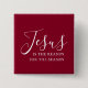 Jesus is the reason for the season. Share the reason for the Christmas season with this stylish, simple yet elegant burgundy button. This Christian faith holiday accessory is beautiful. "Jesus" is written in modern script with "the reason for the season" in elegant simple typography. The text colour is white on a berry red background. This religious Christmas button would be great for sharing the meaning of Christmas with Christmas gifts. Jesus. God's gift. Came down to earth on Christmas. It would suit well to church groups, Christian Charity, and Bible Study groups and a faith filled family. The minimalistic script is editable.