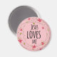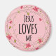 This Christian Magnet features a "Jesus Loves Me" quotes on a Rose pink Wreath Floral background.