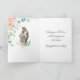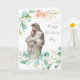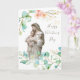 This is a lovely traditional Catholic image of the Blessed Virgin Mother Mary holding the baby Jesus and a lamb. A lovely peach and light green eucalyptus floral design graces the background. The same image with a holy rosary is on the inside left of the card. Text and fonts may be modified.