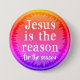 Jesus is the reason for the season Christmas pin. Colourful gradient yellow, oranges pink, and purple design with grunge text in the centre. Pins come as square or round, in many sizes. Perfect for teens in the church youth group, or pass out to the congregation at holiday time.