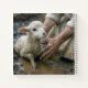 A delicate lamb in a mud puddle while being gently rescued by a shepherd's hands.