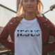 Christian t-shirt for women with Jesus in elegant calligraphy with "the life, the way, the truth"' writing in evidence. This trendy, modern faith design is the perfect gift and fashion statement.